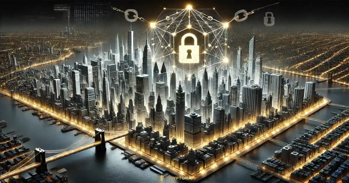 Дигитален град с мрежа от блокчейн връзки и централен катинар, символизиращ законопроект за блокчейн регулация в Ню Йорк.
