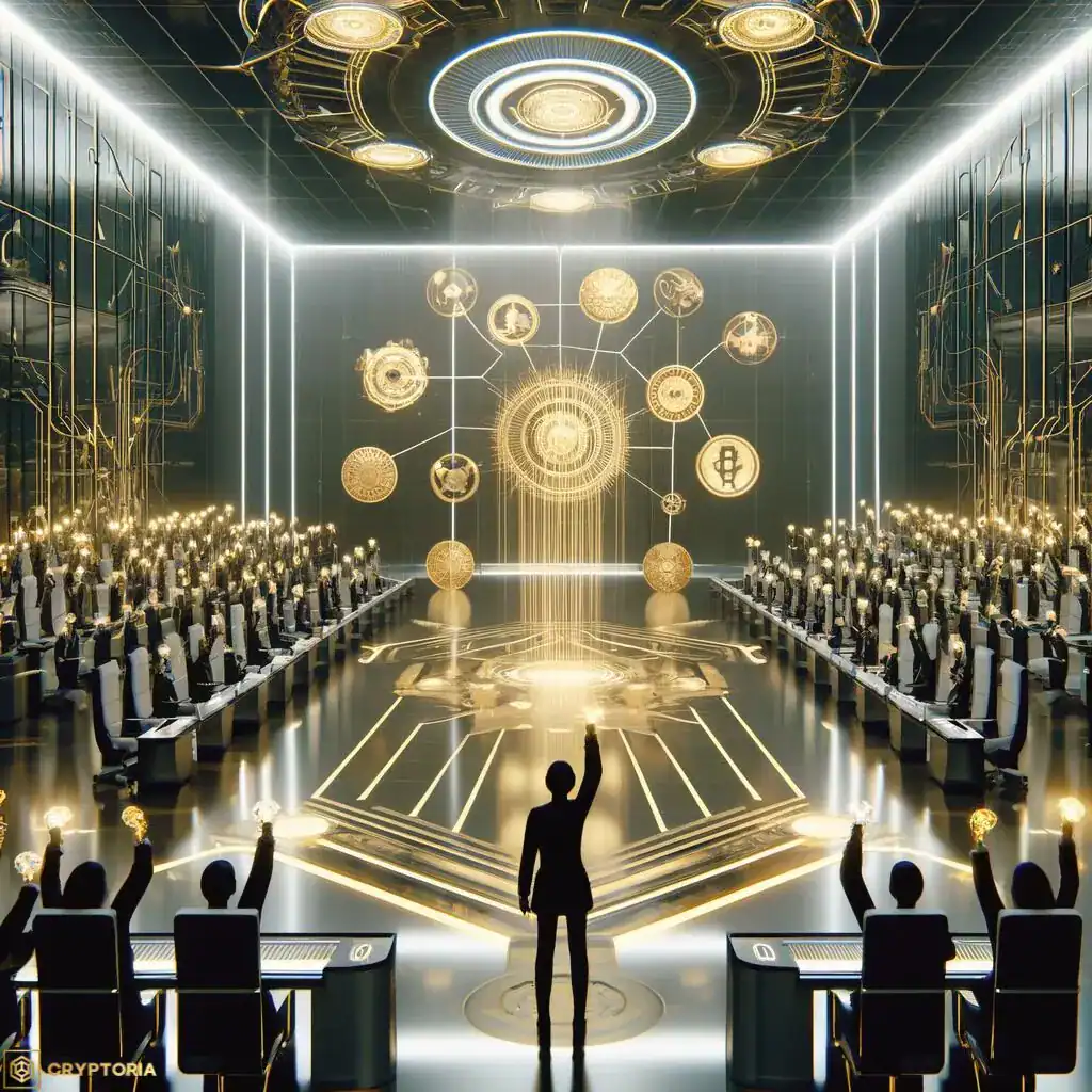 Илюстрация на децентрализирано управление чрез governance токени с гласуване и символи на блокчейн проекти.
